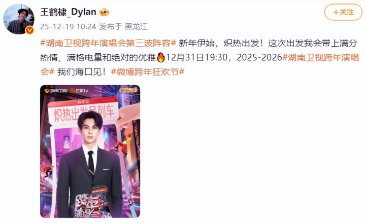 湖南卫视邀请王鹤棣参加跨年演唱会。