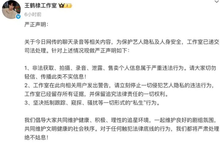 面对这场闹剧,王鹤棣工作室在24小时内发布严正声明。